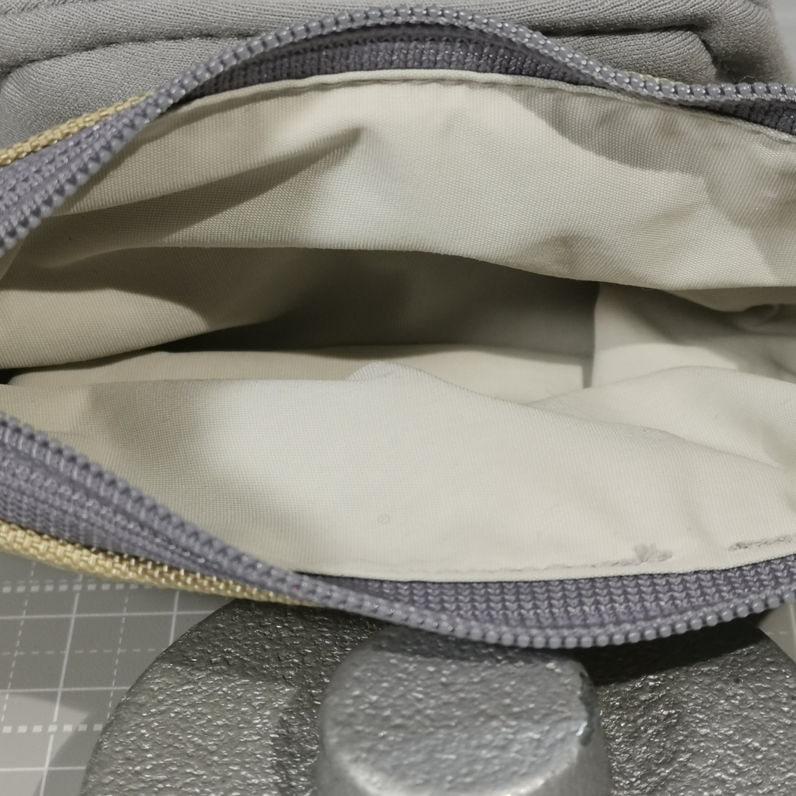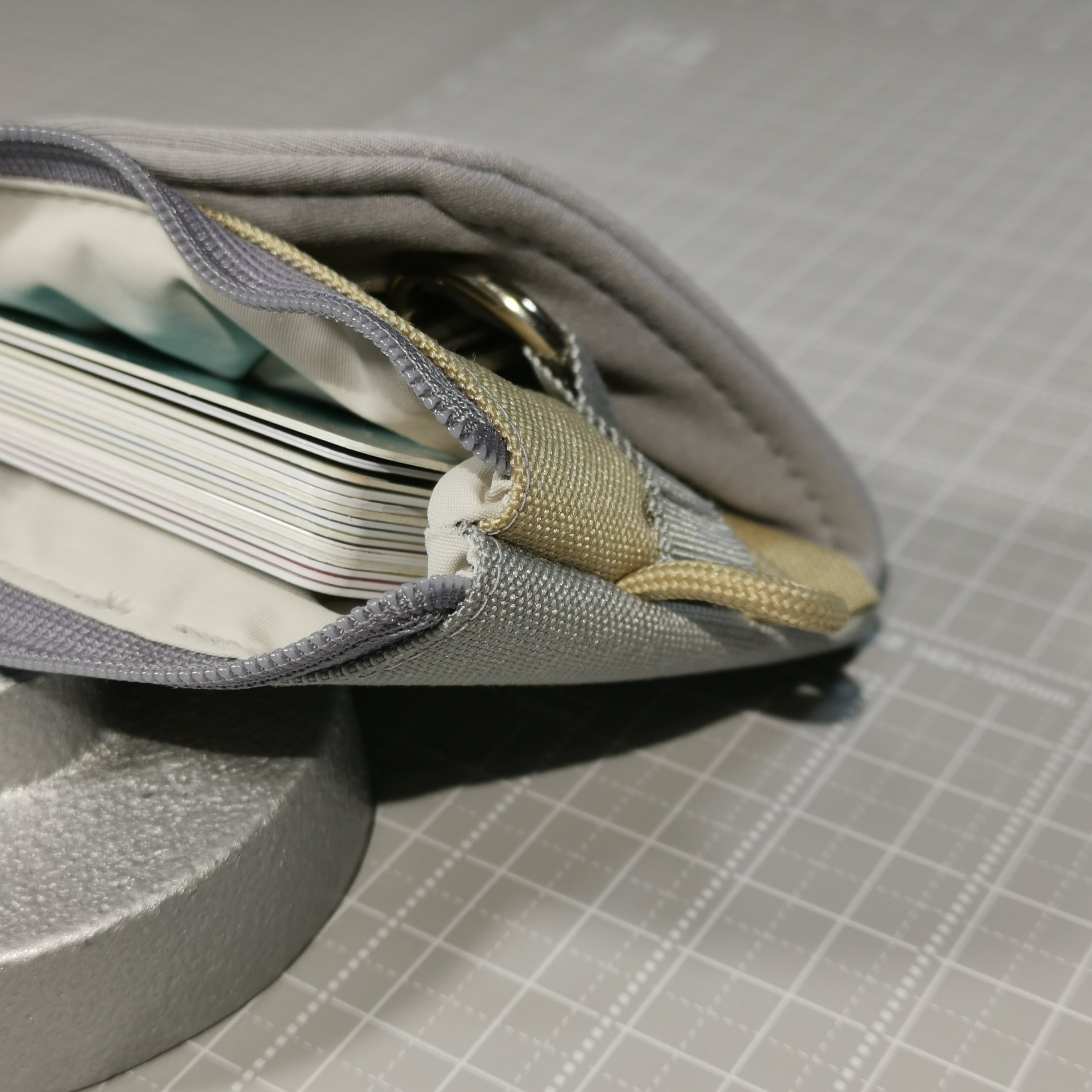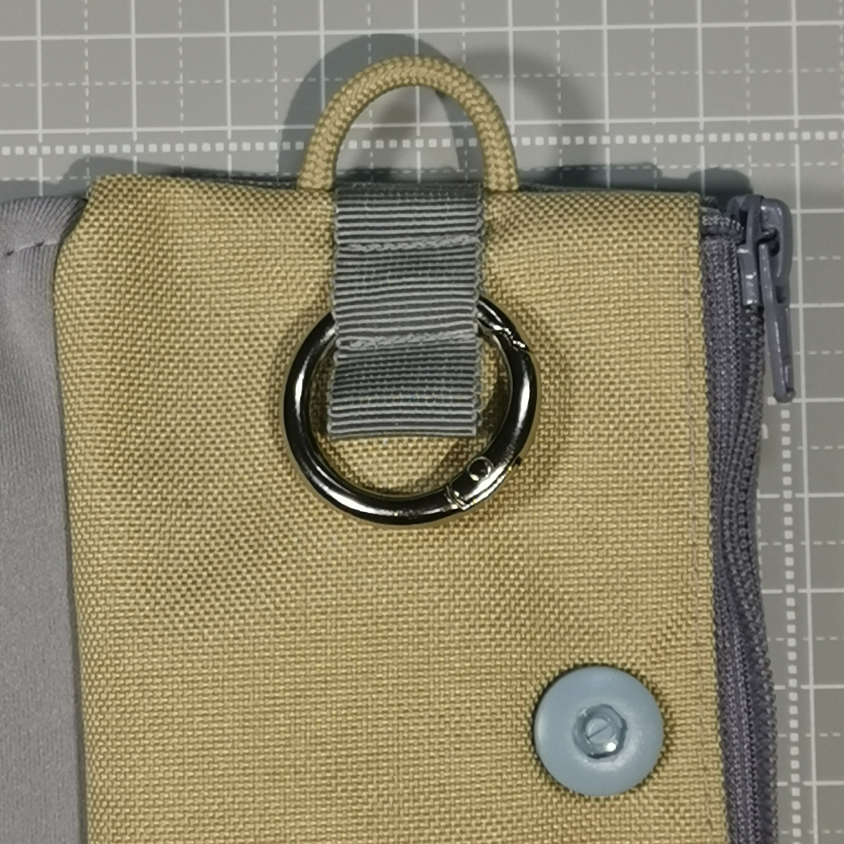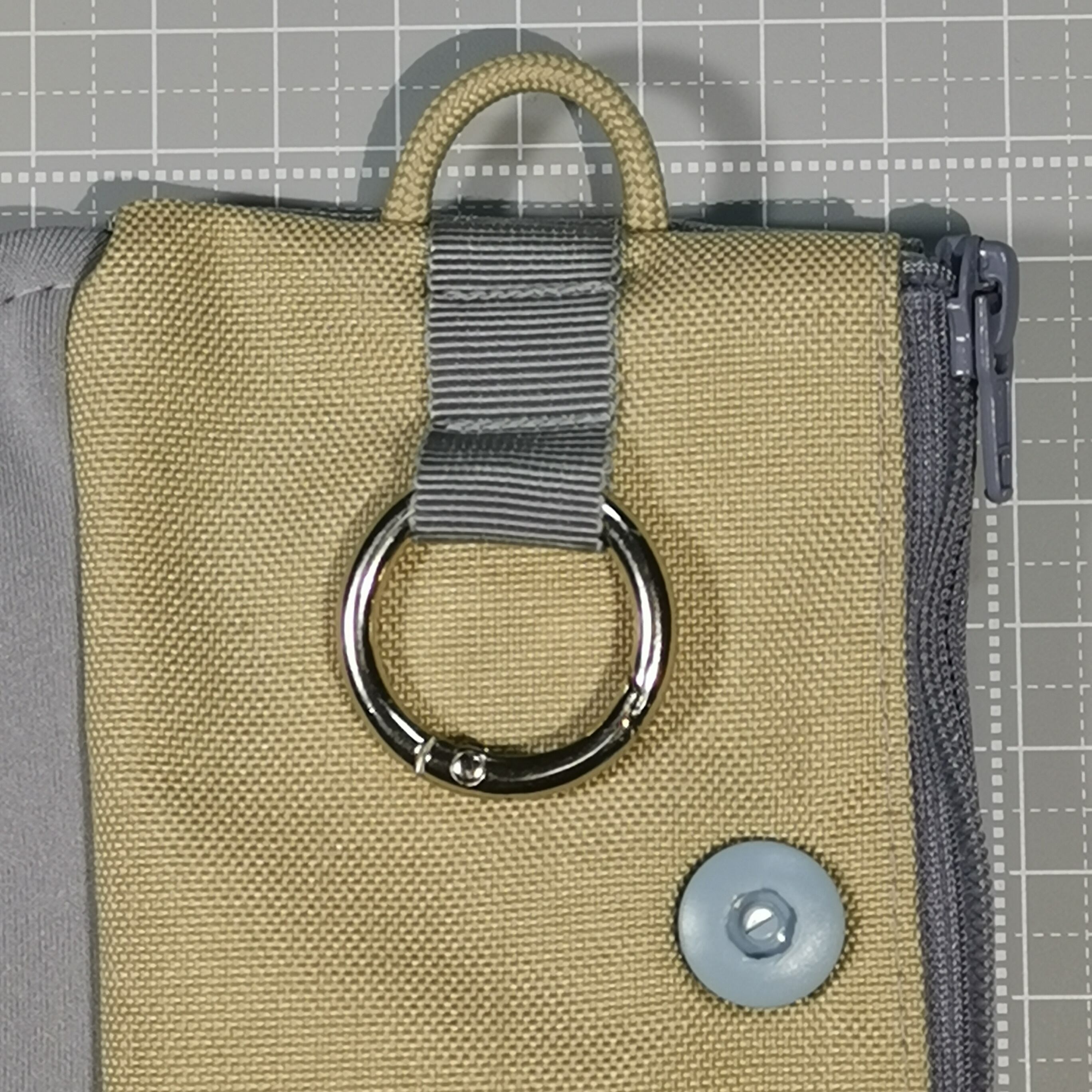 裏地は、グレーとベージュの中間色(グレージュ)で、リングはシルバーです。
