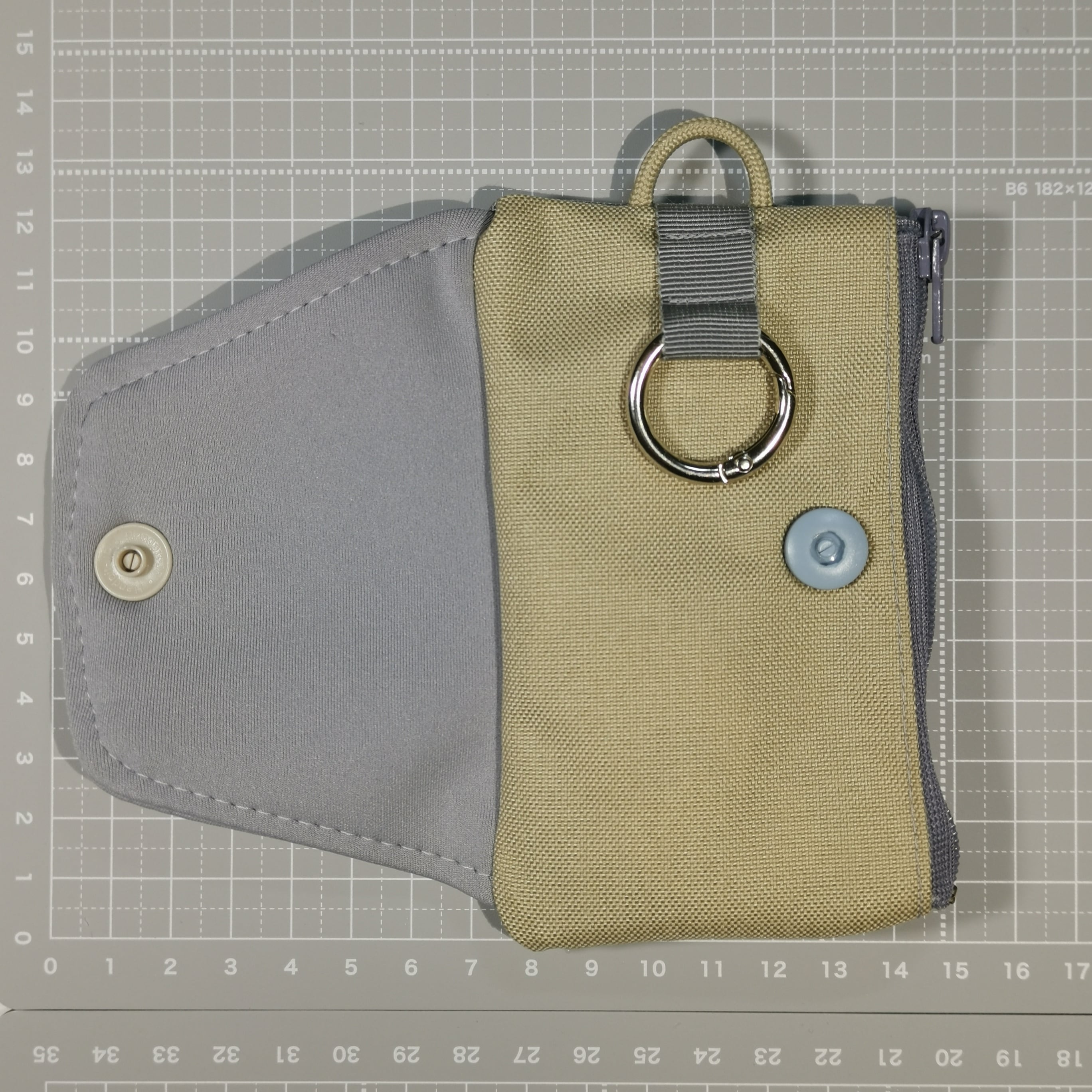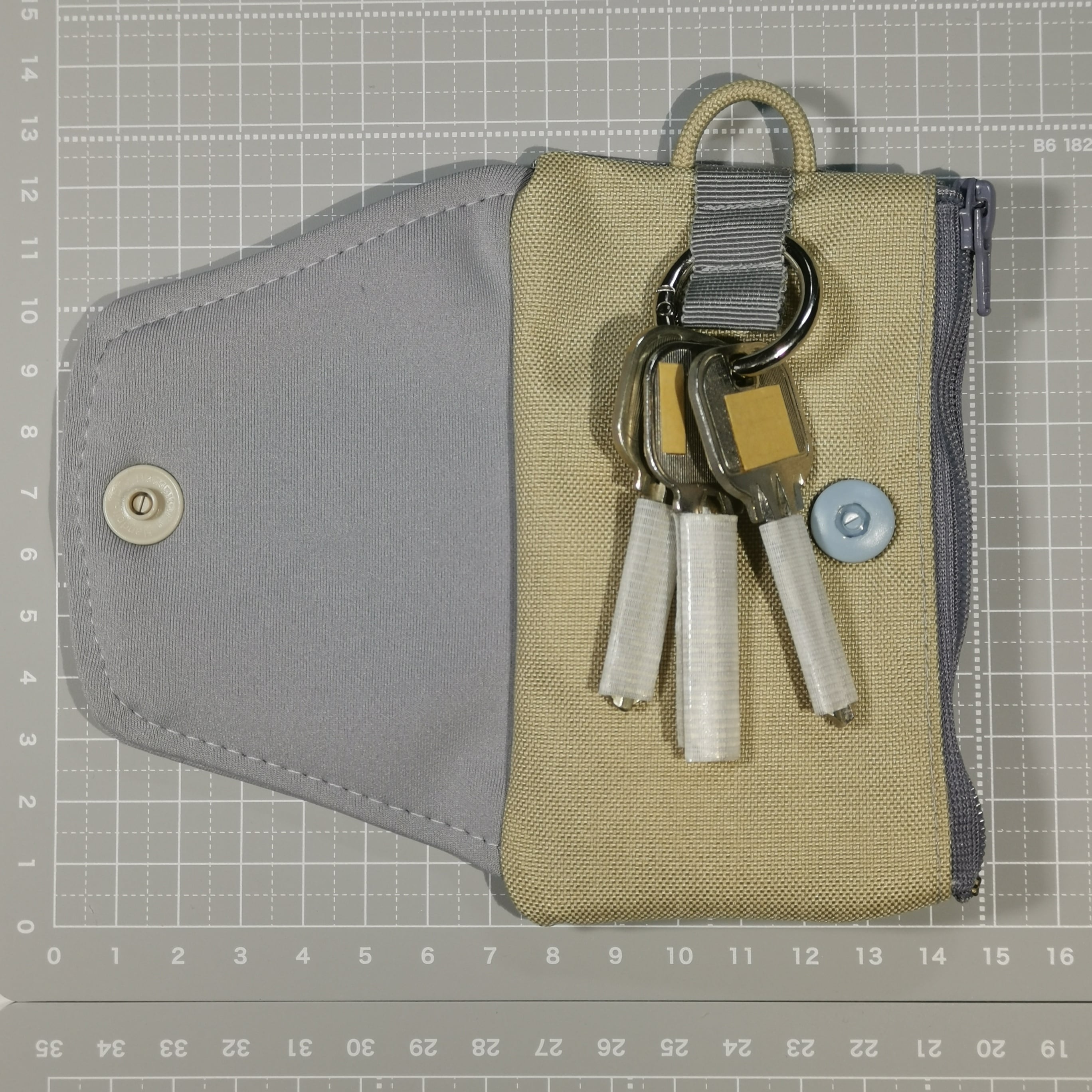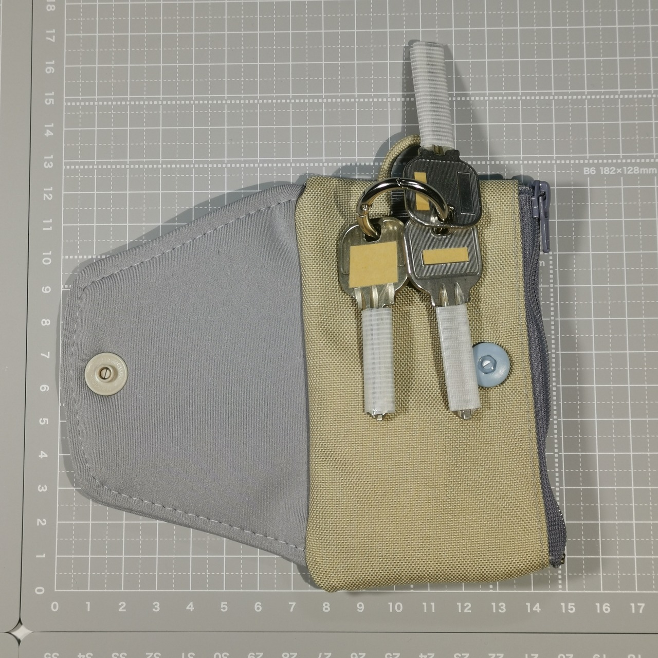 ベージュは、本体のキー側、ひも、ポケット、ホックのカバー側です。
