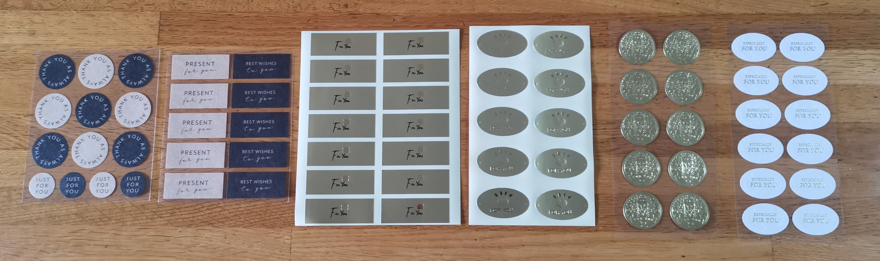 左から、1.円形のTHANK YOU AS ALWAYS(黒)、2.円形のTHANK YOU AS ALWAYS(茶)、3.小さい円形のJUST FOR YOU(黒)、4.小さい円形のJUST FOR YOU(茶)、5.PRESENT for you(茶)、6.BEST WISHES to you(黒)、7.For you(金 四角)、8.FOR YOU(金 楕円)、9.FOR YOU(金 円)、10.ESPECIALLY FOR YOU(白 楕円)です。