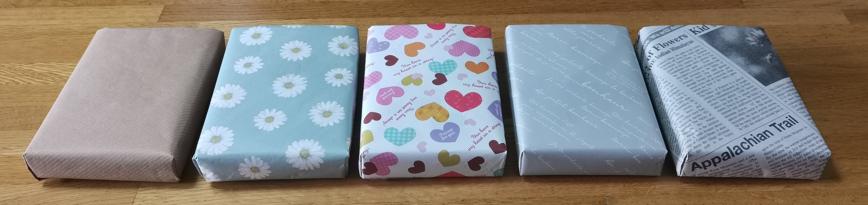 左から、1.クラフト、2.花柄、3.ハート、4.英字、5.英字新聞です。